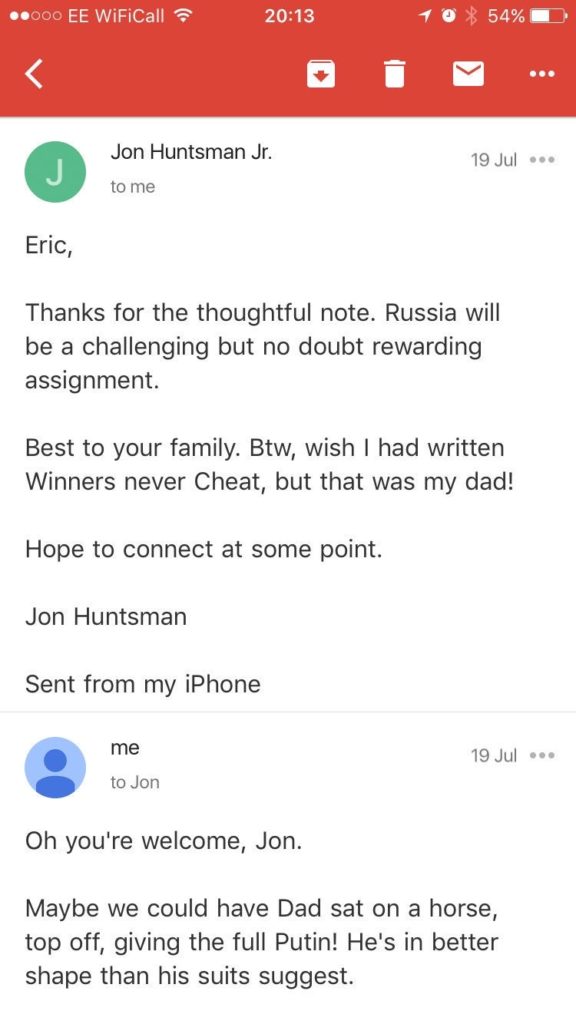 Huntsman, for example, responded pleasantly to a congratulatory note from the prankster posing as Eric Trump. “Thanks for the thoughtful note,” Huntsman wrote. “Russia will be a challenging but no doubt rewarding assignment.”