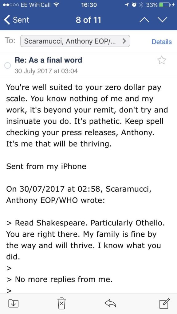 In another angry reply to the fake Priebus, Scaramucci wrote, “Read Shakespeare. Particularly Othello. You are right there. My family is fine by the way and will thrive. I know what you did.”